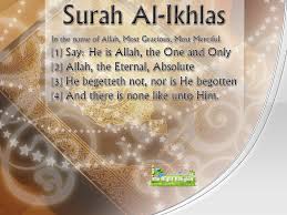 membaca 10 jus kitab Al-Quran. Lalu dengan membaca surah Al-Ikhlas sebanyak tiga kali qatamlah Quran kerana ianya sama dengan membaca 30 jus Al-Quran.